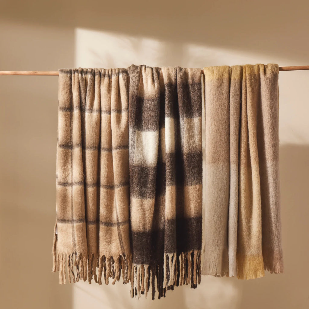 This Morgan Wool Blend Woven Throw is crafted from a soft touch wool, acrylic and polyester blend in a brown, taupe and white checkered pattern. Place over a sofa, bed, bay window and more for a cosy aesthetic or use it as a comforting wrap in cold weather.